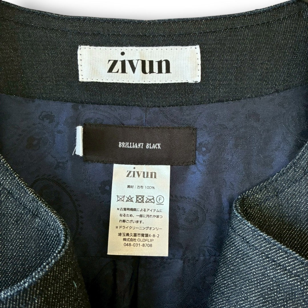 This denim collarless coat by BRILLIANT BLACK is a reconstructed long coat made from upcycled denim.