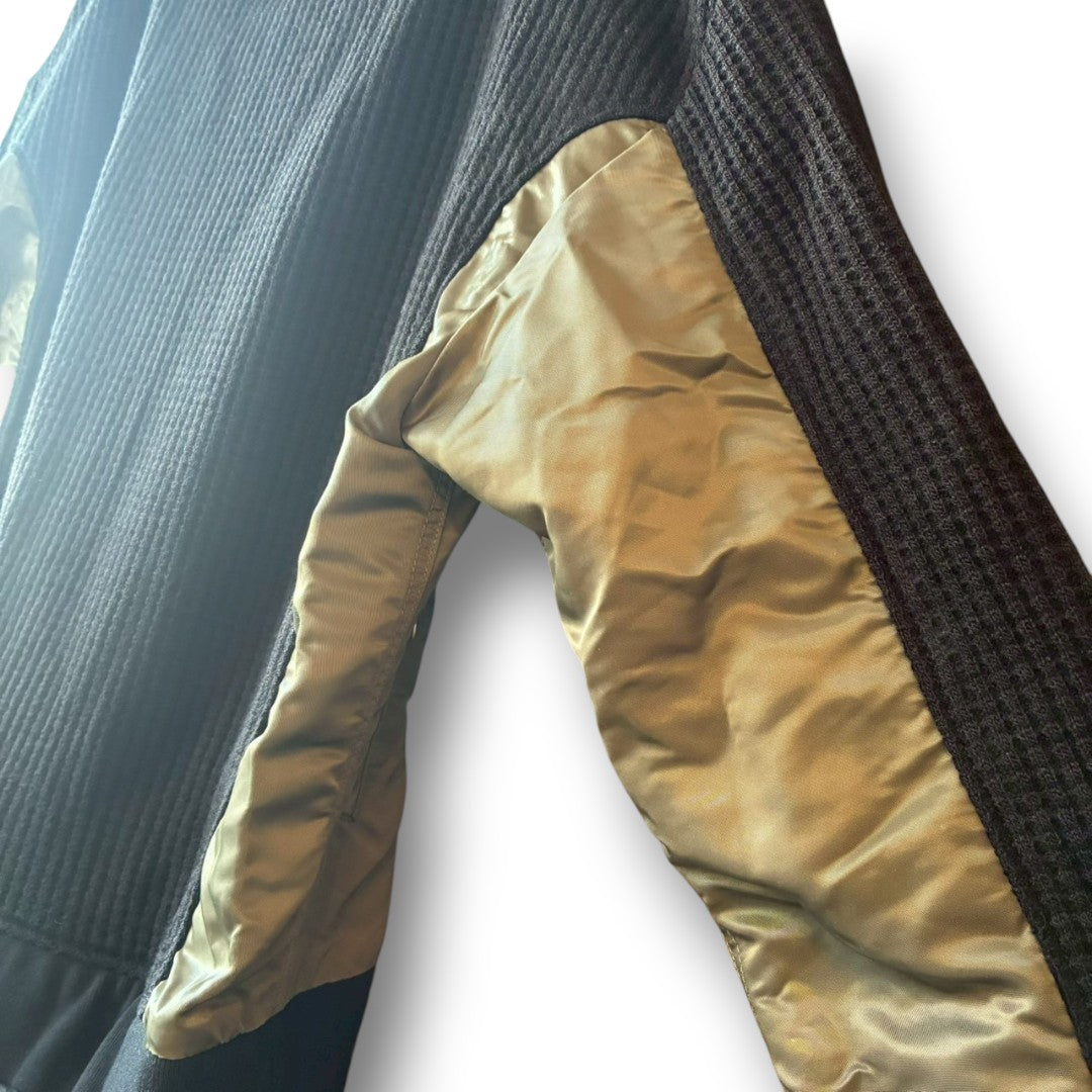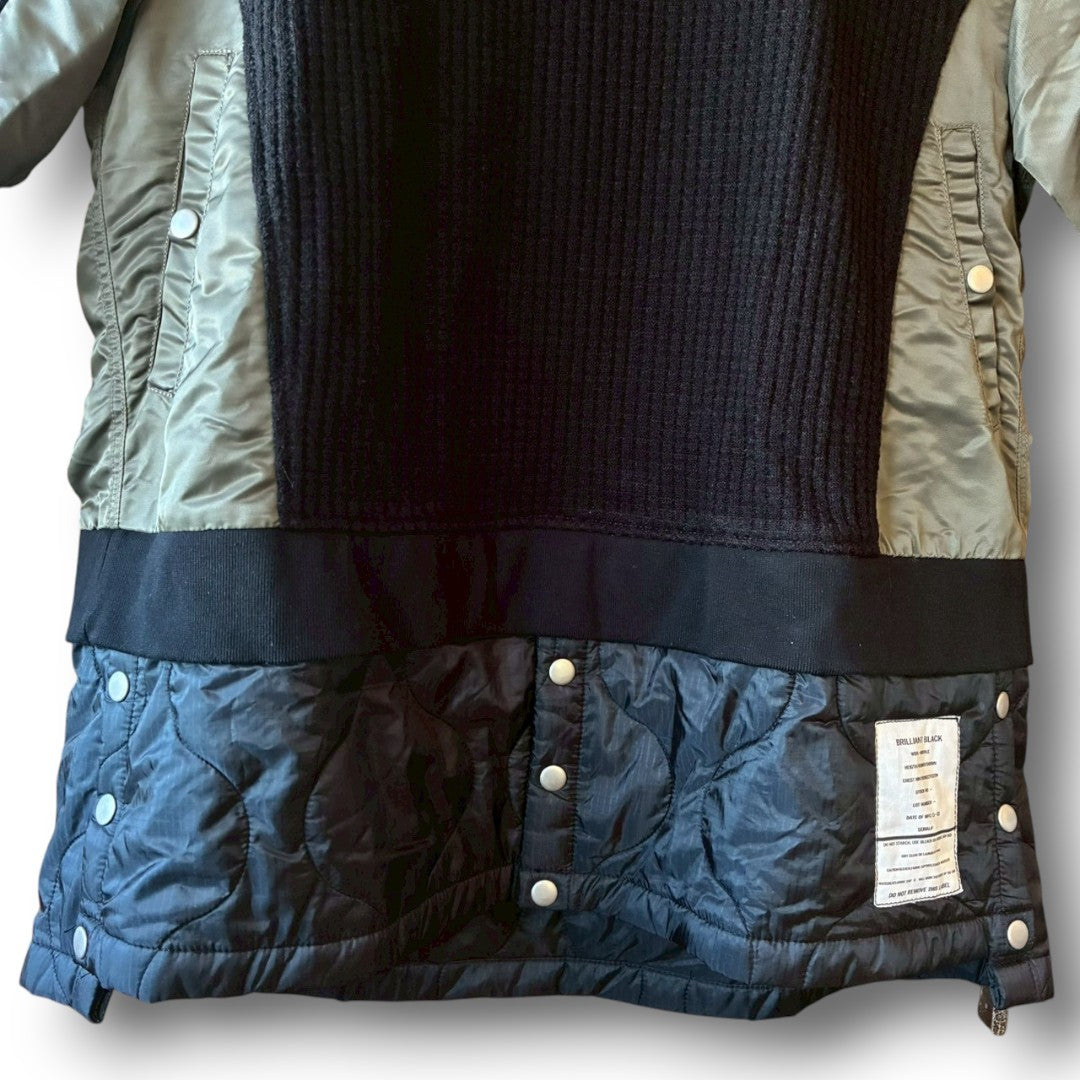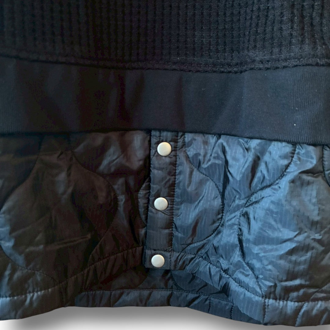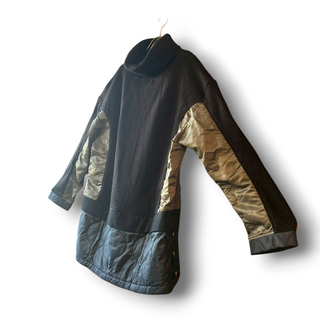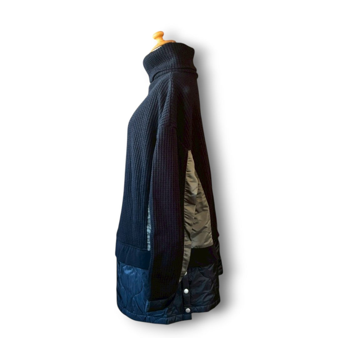 This wide turtleneck knit by BRILLIANT BLACK is a reconstructed piece made from knit fabric combined with padded nylon and mixed upcycled materials.