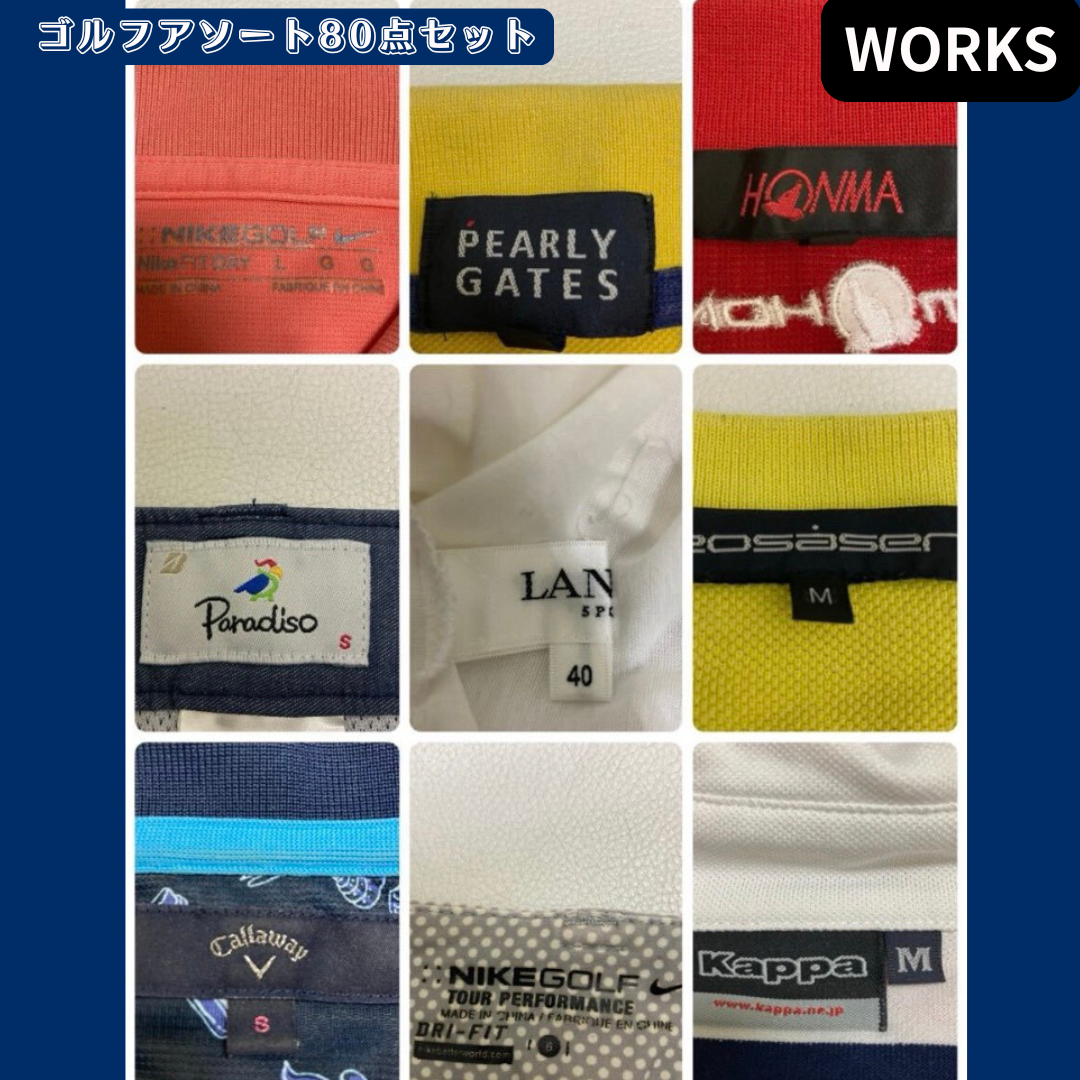 国内外の人気ブランドゴルフウェアを中心に構成した、メンズ・レディース混合のアソート80点セットです。