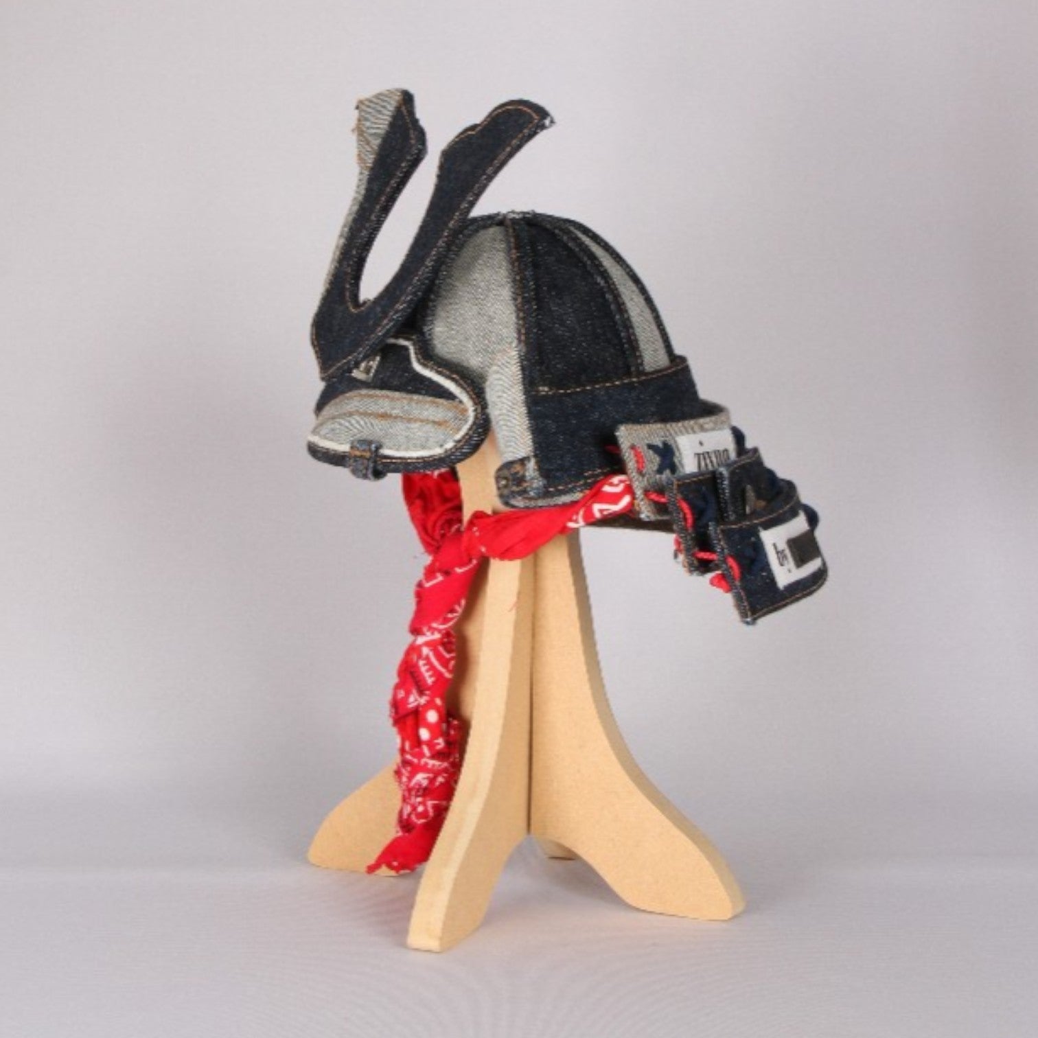 This artwork merges the traditional Japanese samurai helmet (Kabuto) with used denim fabric.