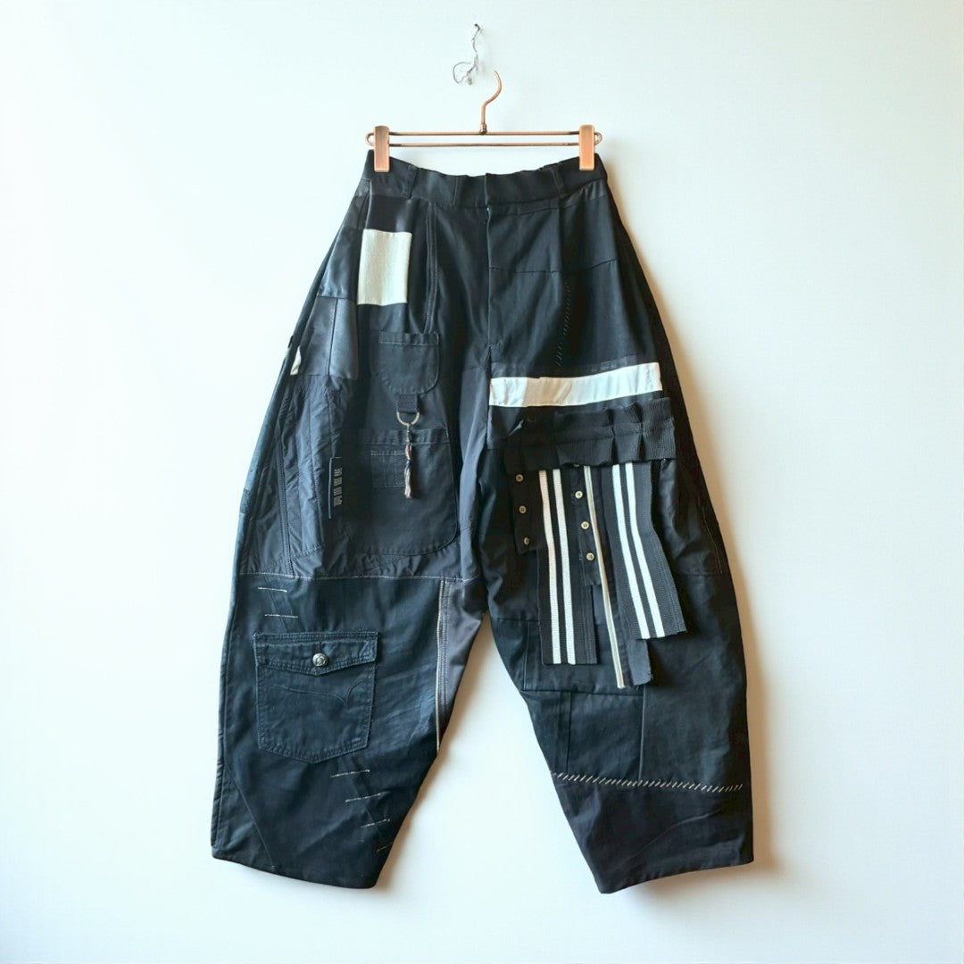 These one-of-a-kind easy wide-leg pants are crafted from reconstructed vintage clothing. Vintage materials have been disassembled and reconstructed, with a variety of patchwork and stitching to create a look that combines style with functionality. The black base is combined with white accents and different materials for a striking pair that blends street style with modern fashion.