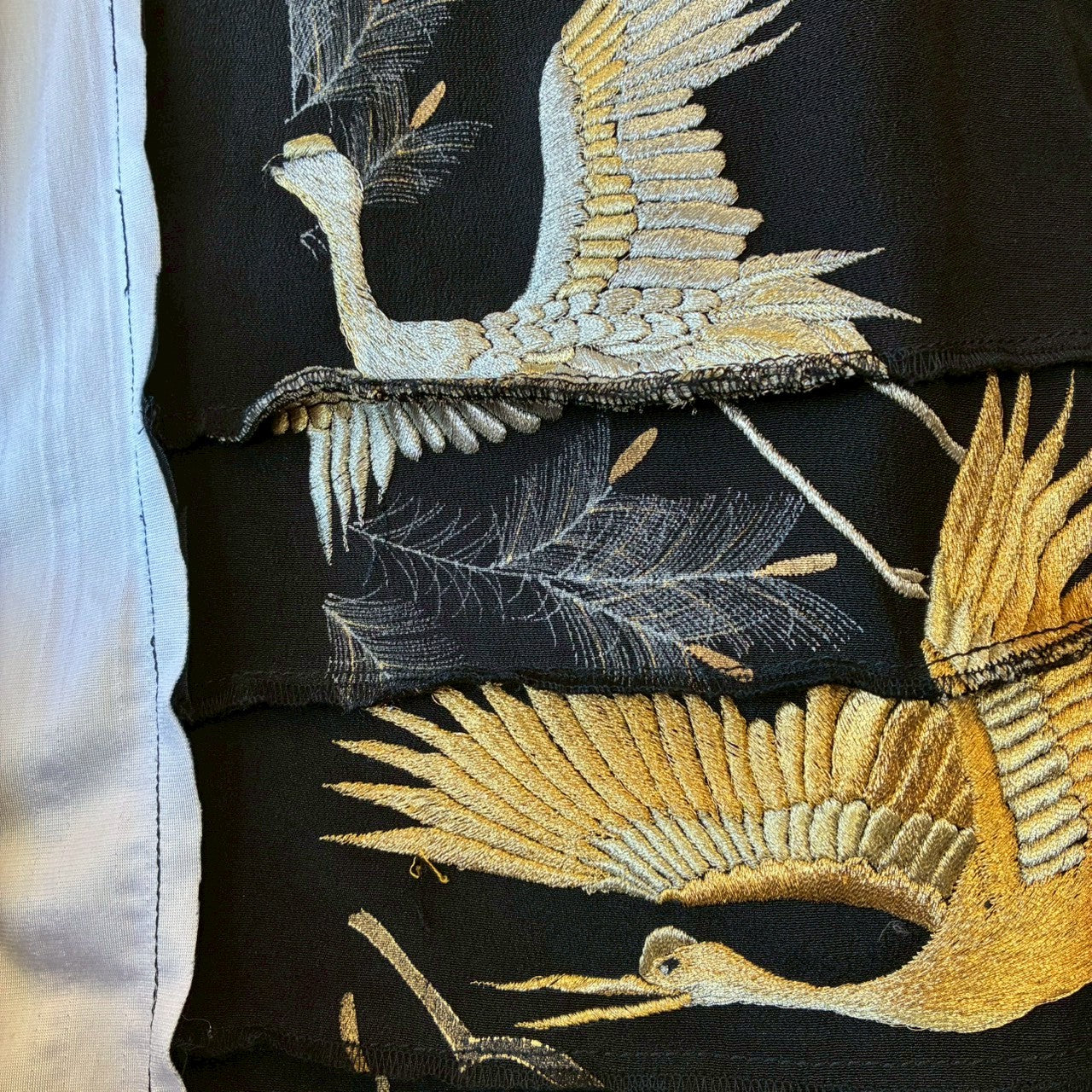 Traditional kimono textiles, quilted panels, and technical fabrics are boldly reconstructed, while golden crane embroidery and botanical motifs create refined contrast.