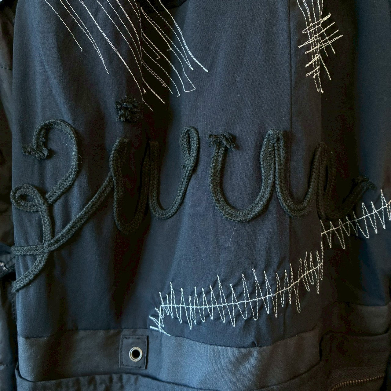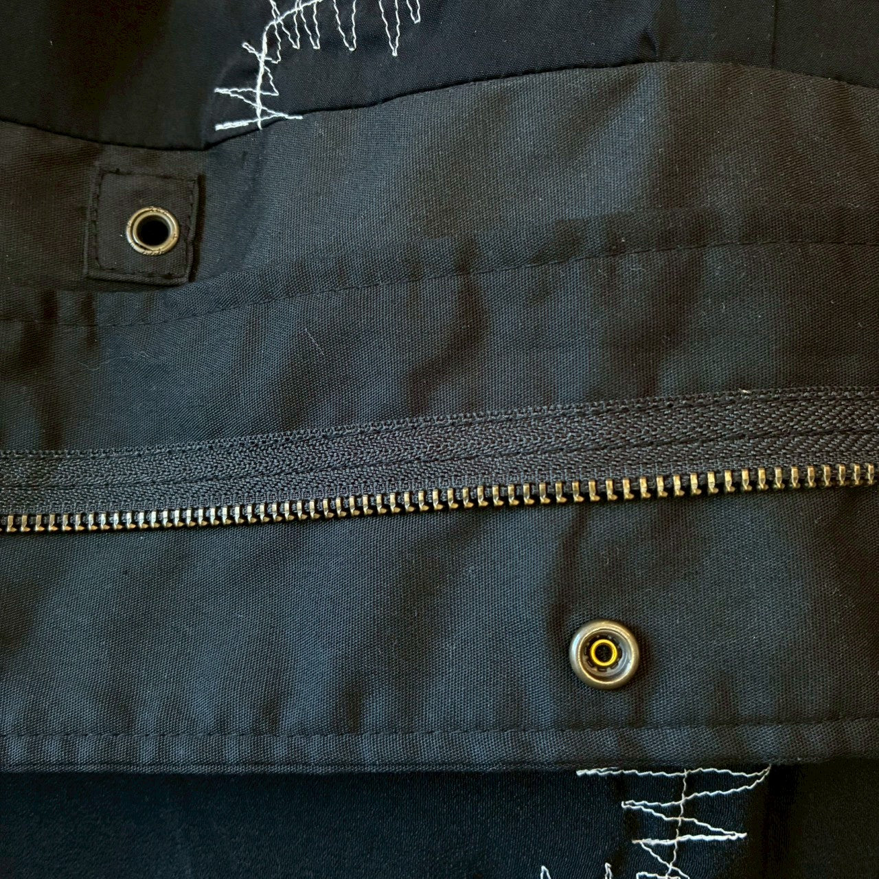 The placement of panels and embroidery is entirely unique, embodying zivun’s philosophy of reconstruction as wearable art.
