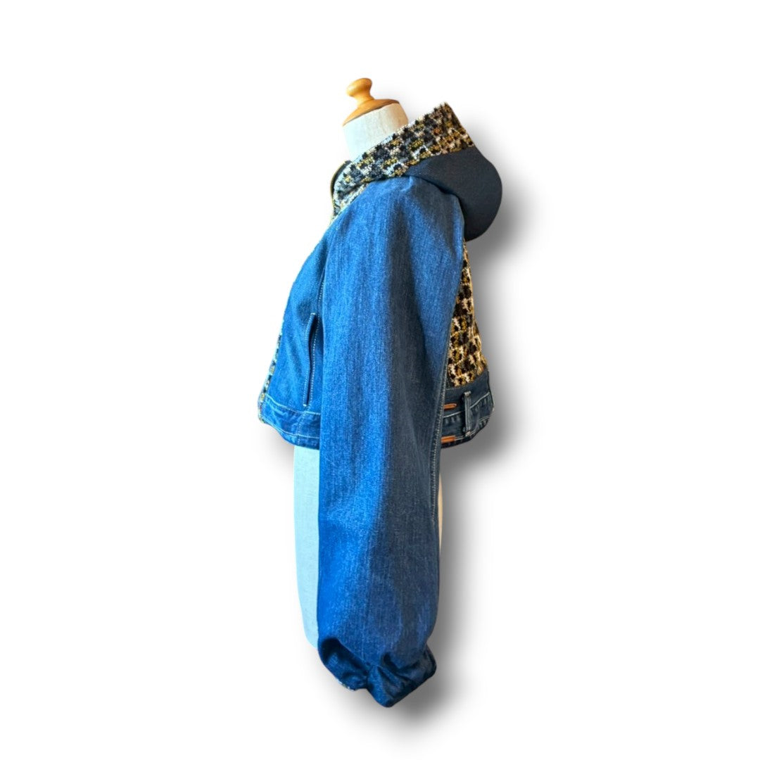 Upcycled denim is reconstructed with tweed patchwork panels across the front, back, and hood lining.