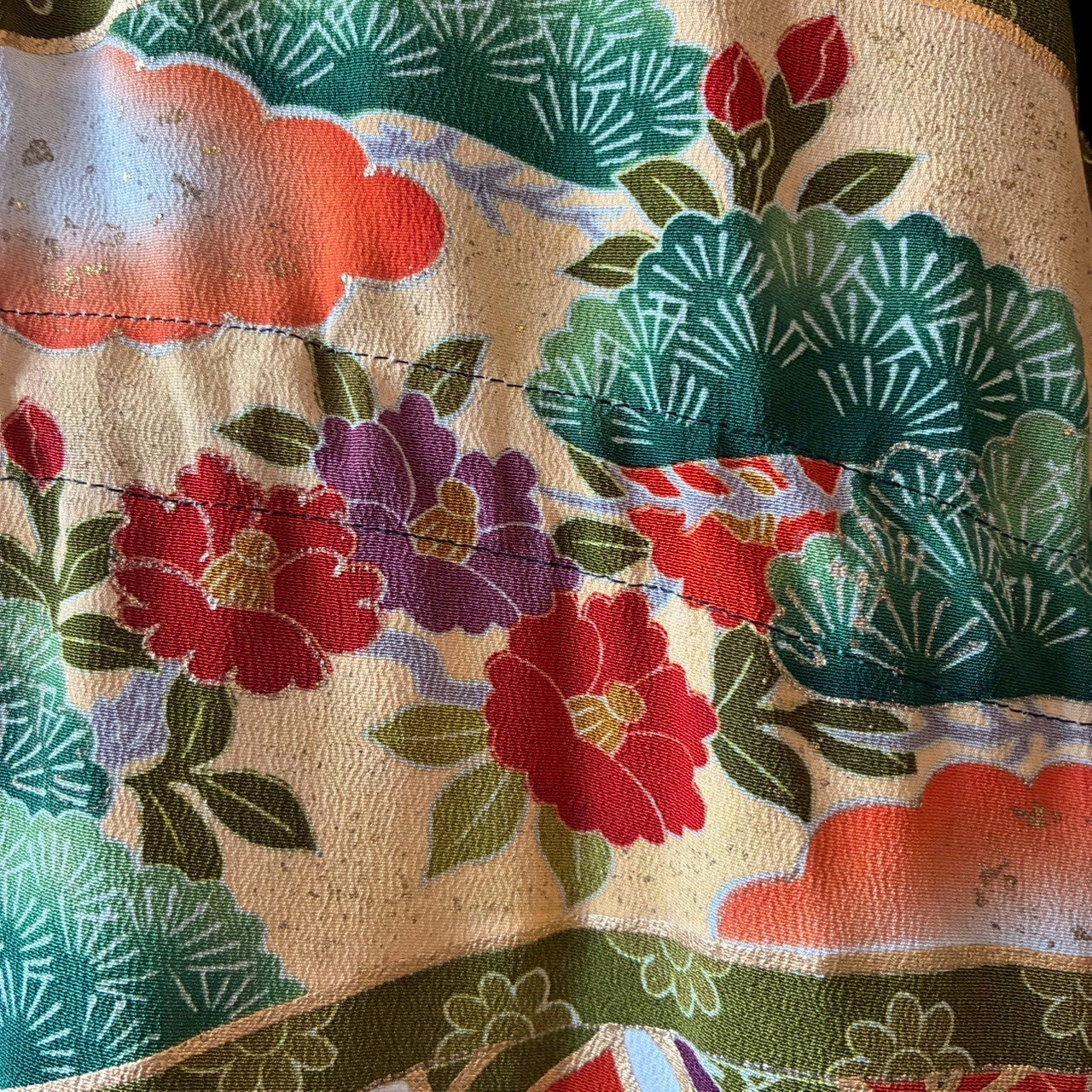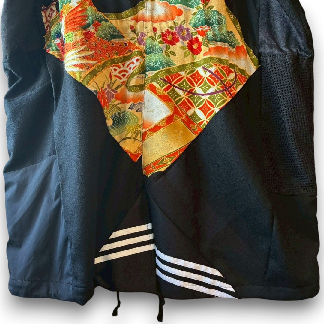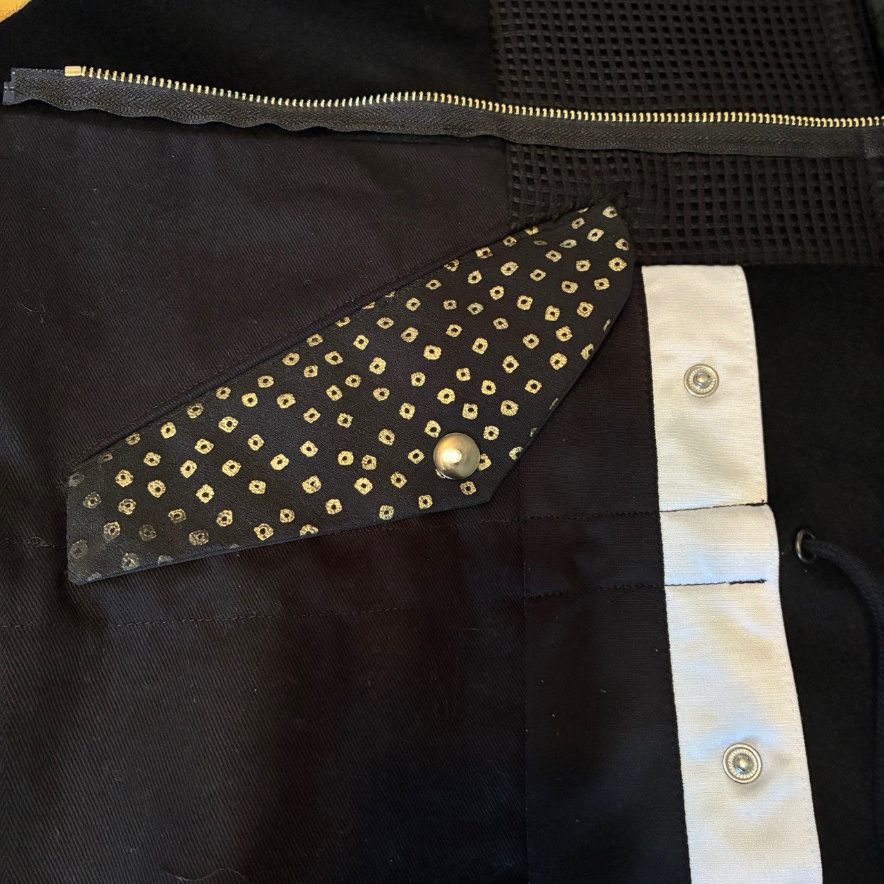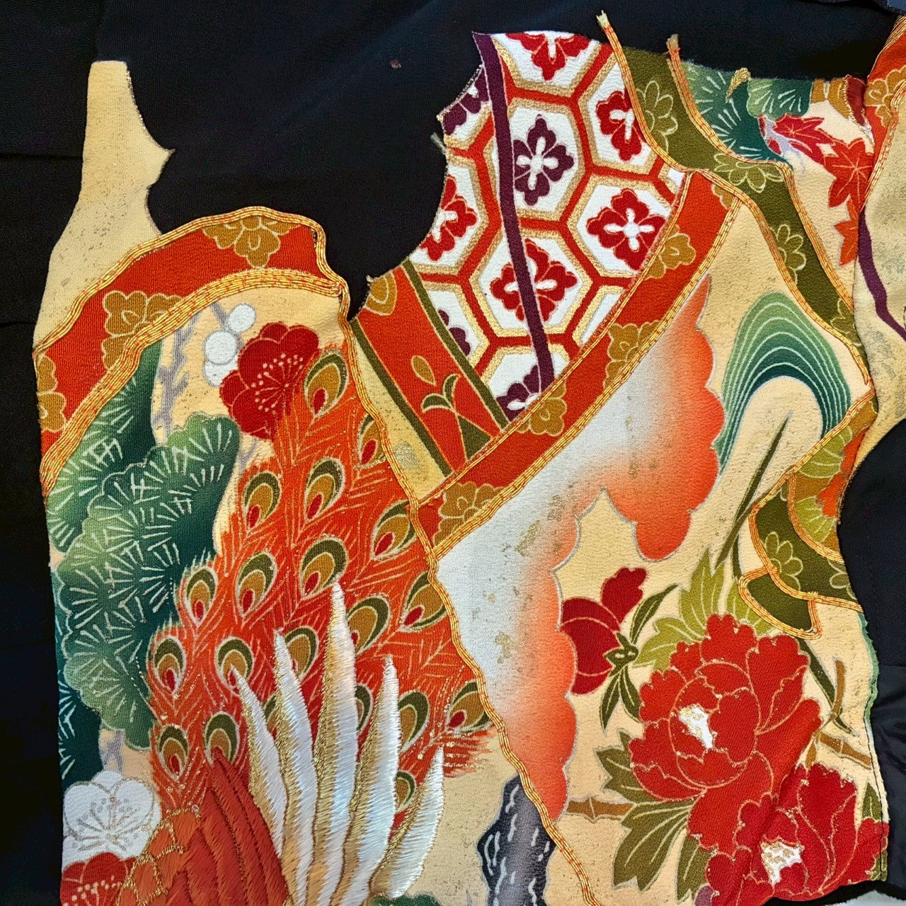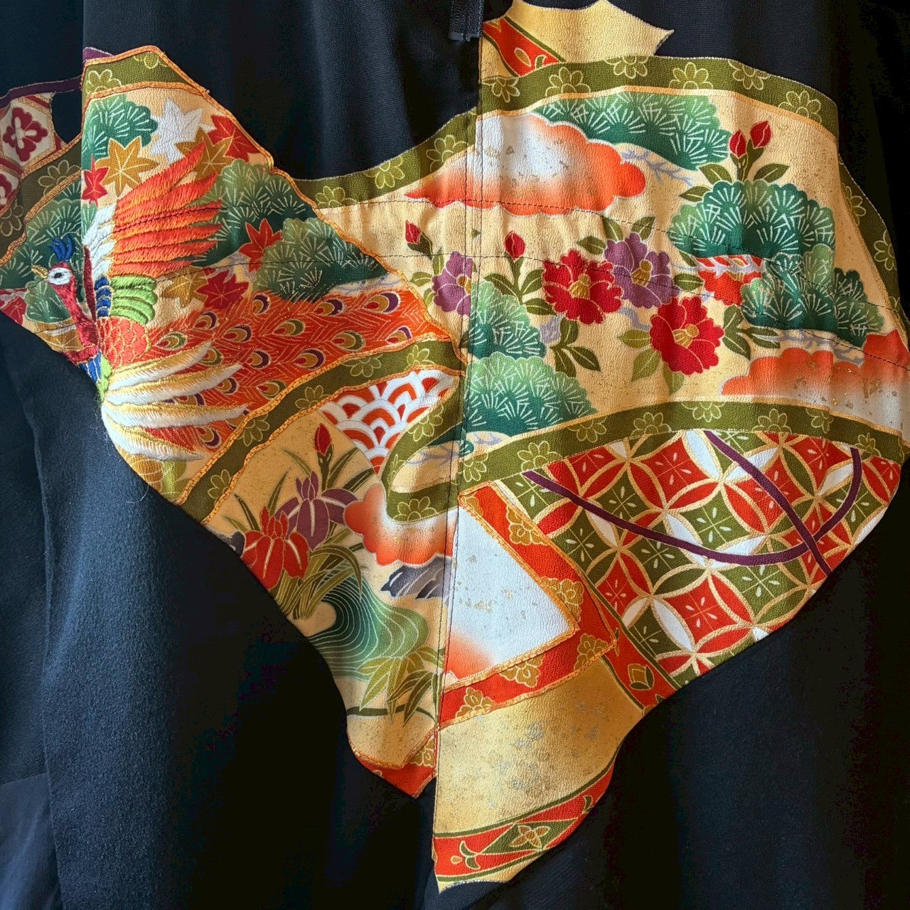 黒留袖の上質な生地をベースに、デニムやナイロンなど異なる古着素材を組み合わせ、唯一無二のパッチワークデザインに仕上げました。
