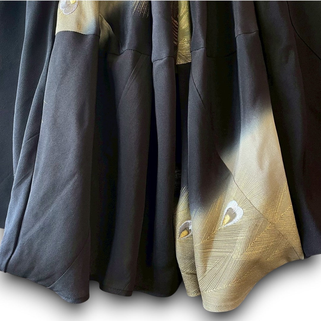 上質な黒留袖を解体し、華やかな孔雀の金糸刺繍を前面に大胆に配置。