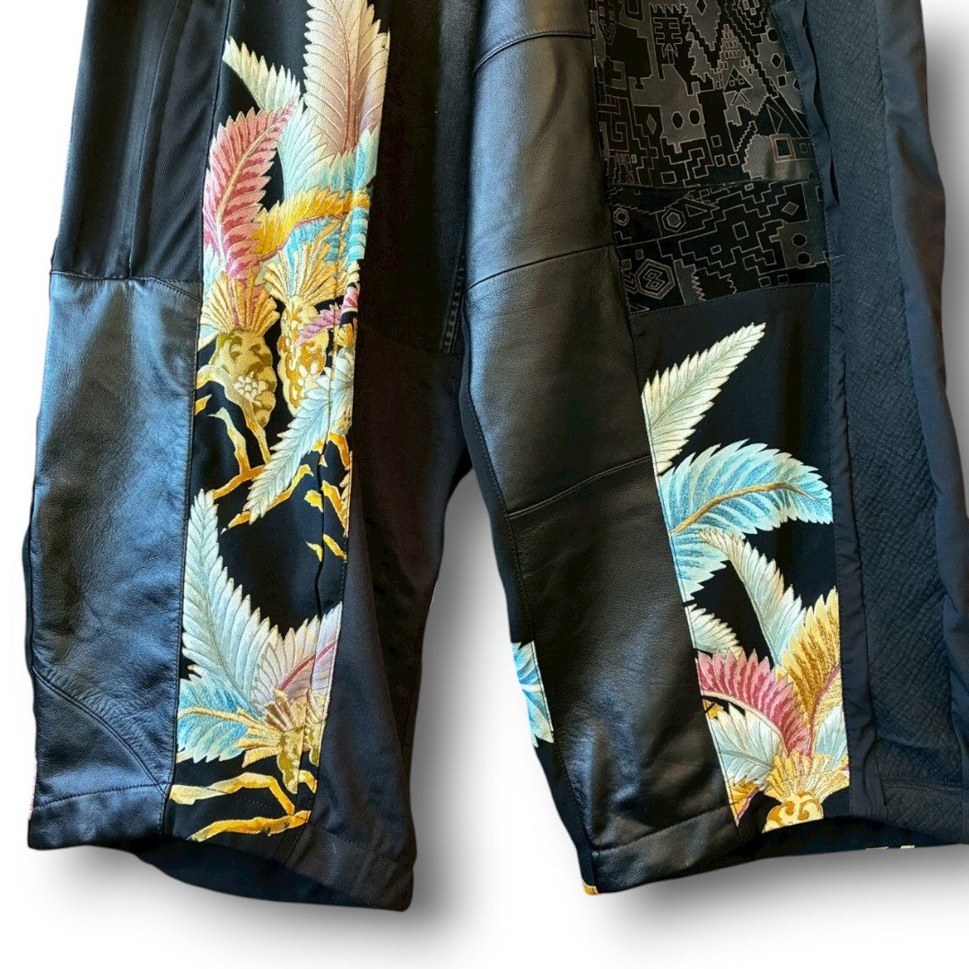 These reconstructed kimono easy pants by zivun by Kohashi are a one-of-a-kind piece combining traditional kurotomesode motifs with mixed contemporary fabrics.