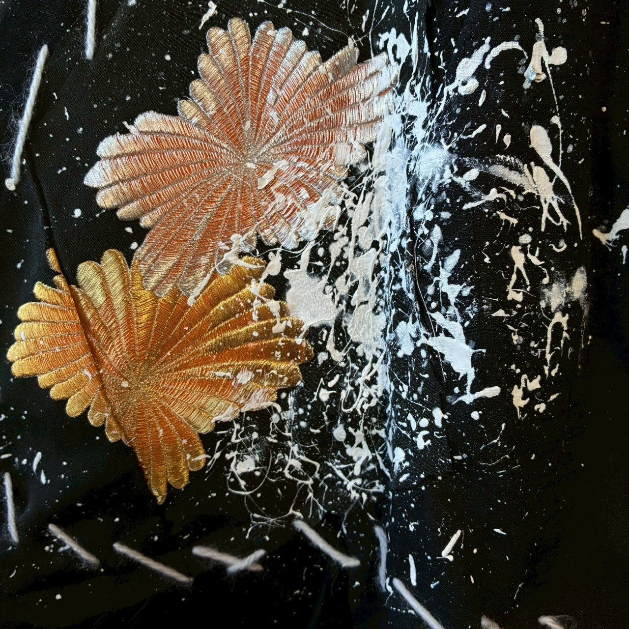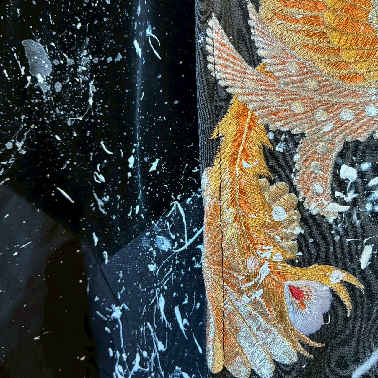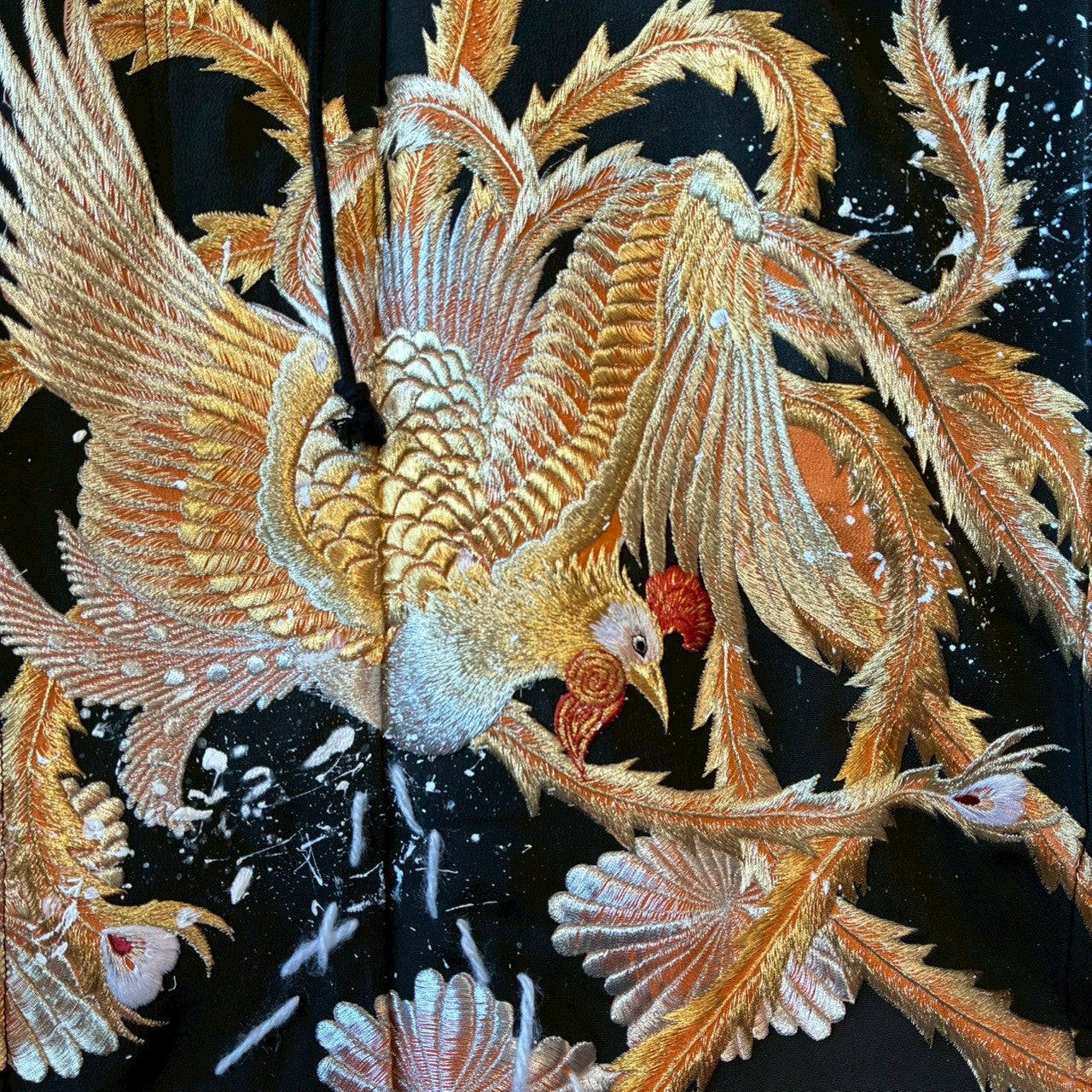 鳳凰モチーフの立体刺繍とスプラッシュ加工が重なり合い、