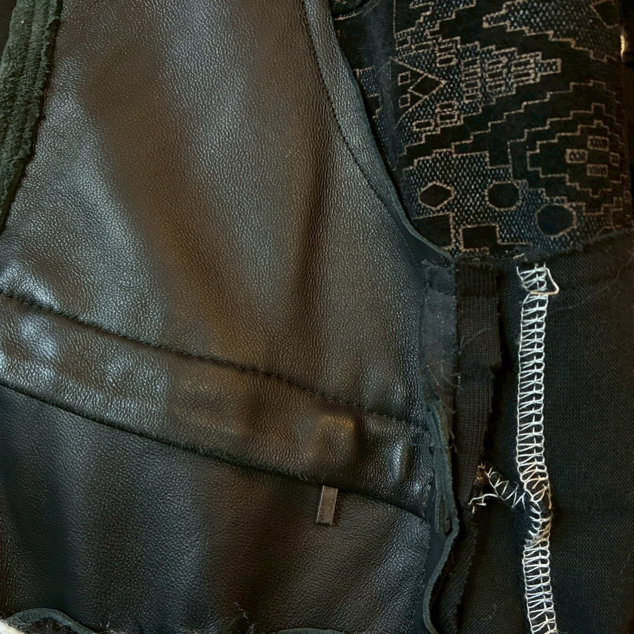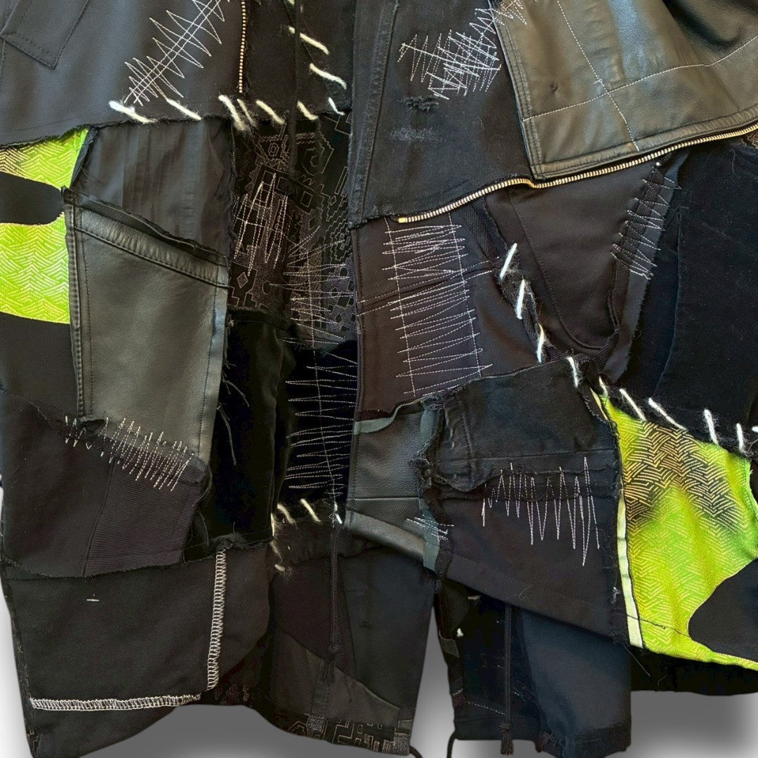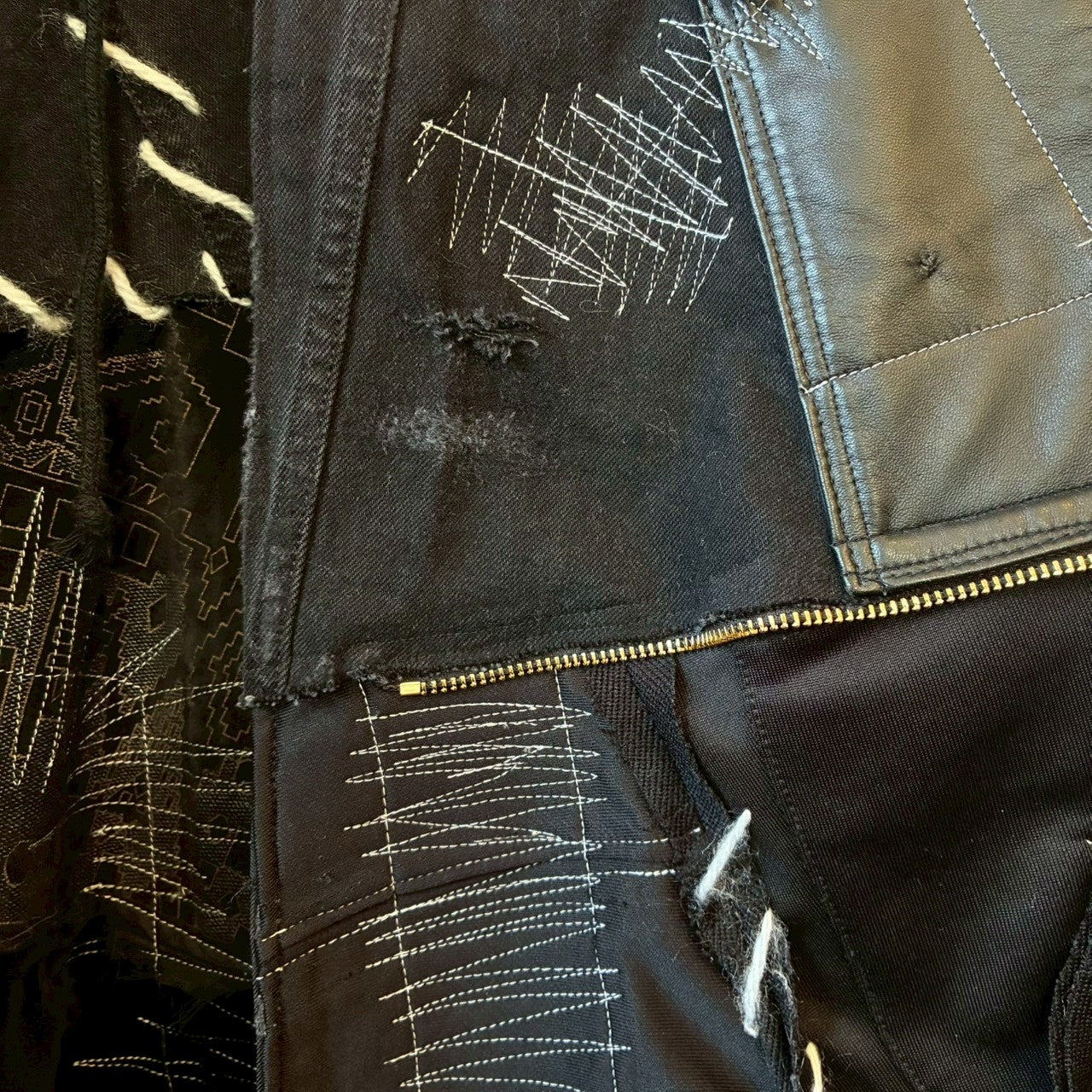 Raw-edge layering and hand-stitched details emphasize dimensional patchwork construction.