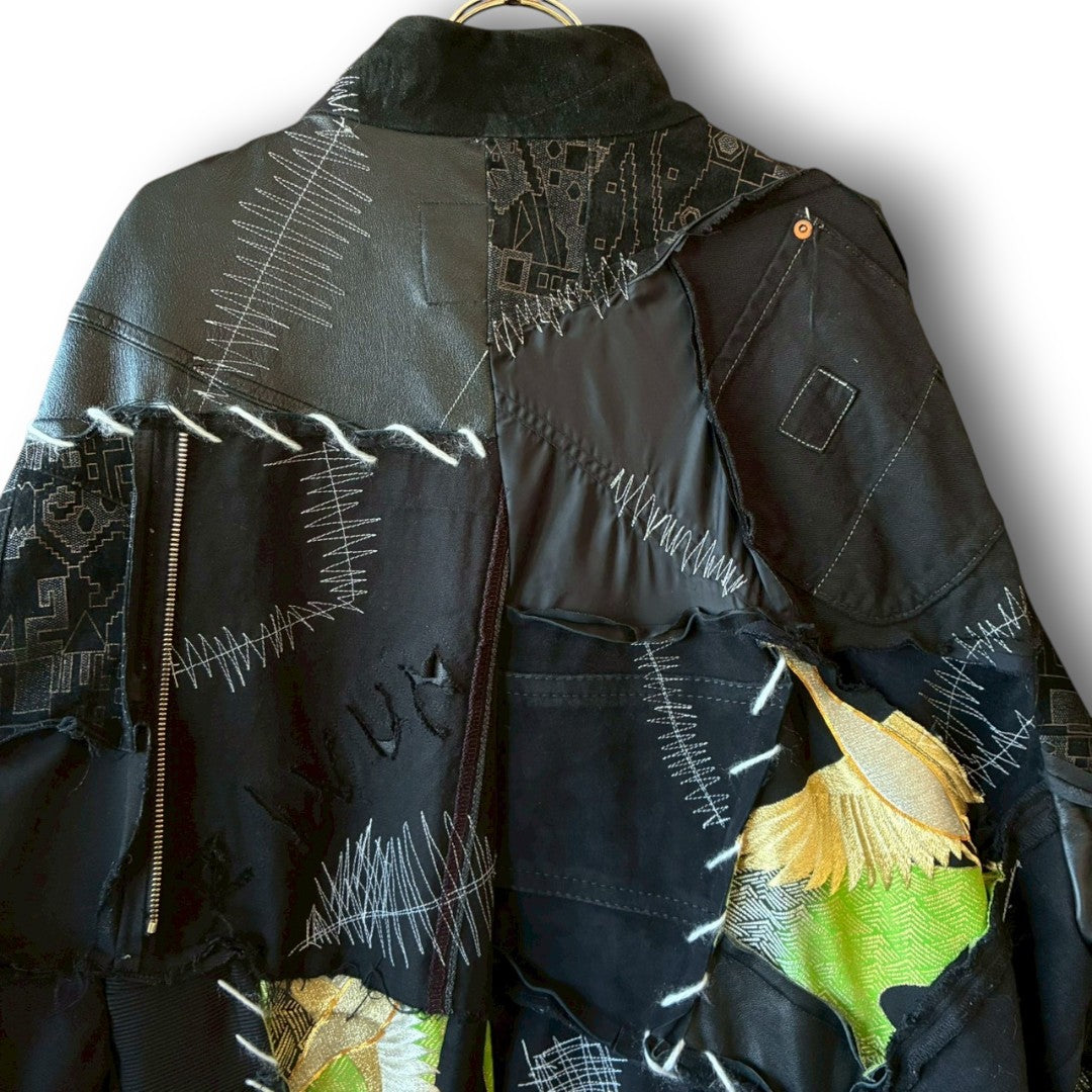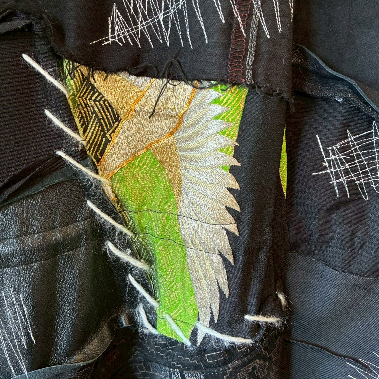 The black base is layered with crane motif kimono fabric and mixed materials, merging military-inspired structure with traditional Japanese textile heritage.