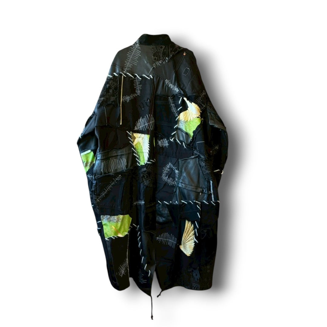 無骨なミリタリー由来のモッズコートと、日本の伝統意匠が交錯する一点物です。