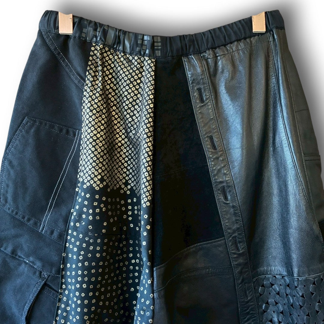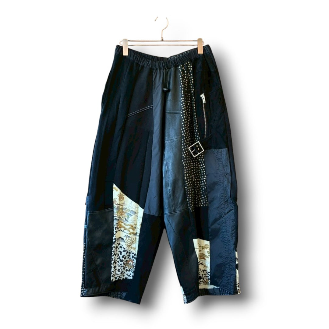 This reconstructed kimono easy pants by zivun by nao is a one-of-a-kind piece combining traditional kimono fabric with leather, nylon, and mixed upcycled materials.